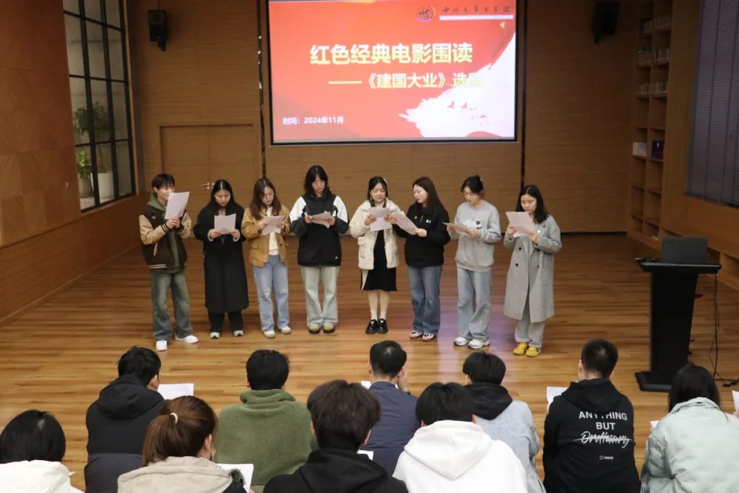 随后,学院师生共同进行了经典红色电影《建国大业》选段围读,在剧本围读中重温了新中国成立前夕的不同历史时刻,切身体会到无数革命前辈们的光辉事迹,感悟到伟大的革命情怀。激发了在场师生对历史的敬畏、对英雄的敬仰和对未来的希望。